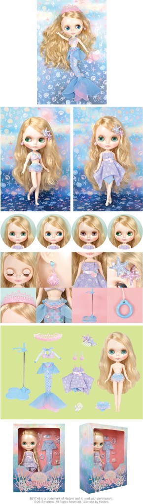 Set Includes: Doll, mermaid fin, dress, bikini, tiara, head accessories, earrings, shoes, and stand (17.5 cm)