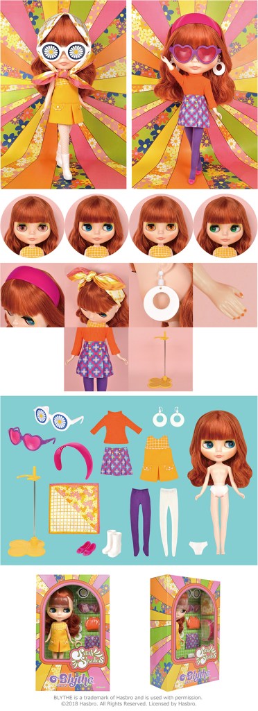 Set Includes: Doll, dress, high neck top, skirt, scarf, headdress, sunglasses (circle and heart-shaped), ear ring, tights (mesh and purple), shorts, shoes (flats, boots), and stand (16 cm)