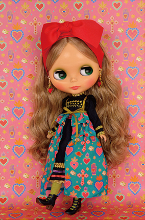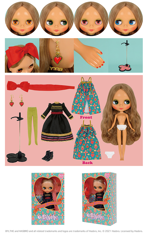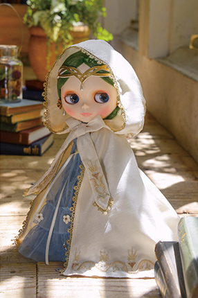 Set includes: doll, long dress, hooded cloak, hair accessory, shorts, earrings, socks, shoes and stand.