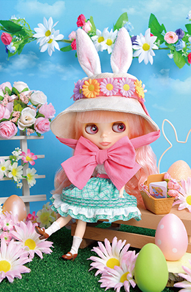 Set includes: doll, blouse, skirt, hat, catsuit with ribbon, basket, Easter card, flower tassel, drawers, socks, shoes, stand.