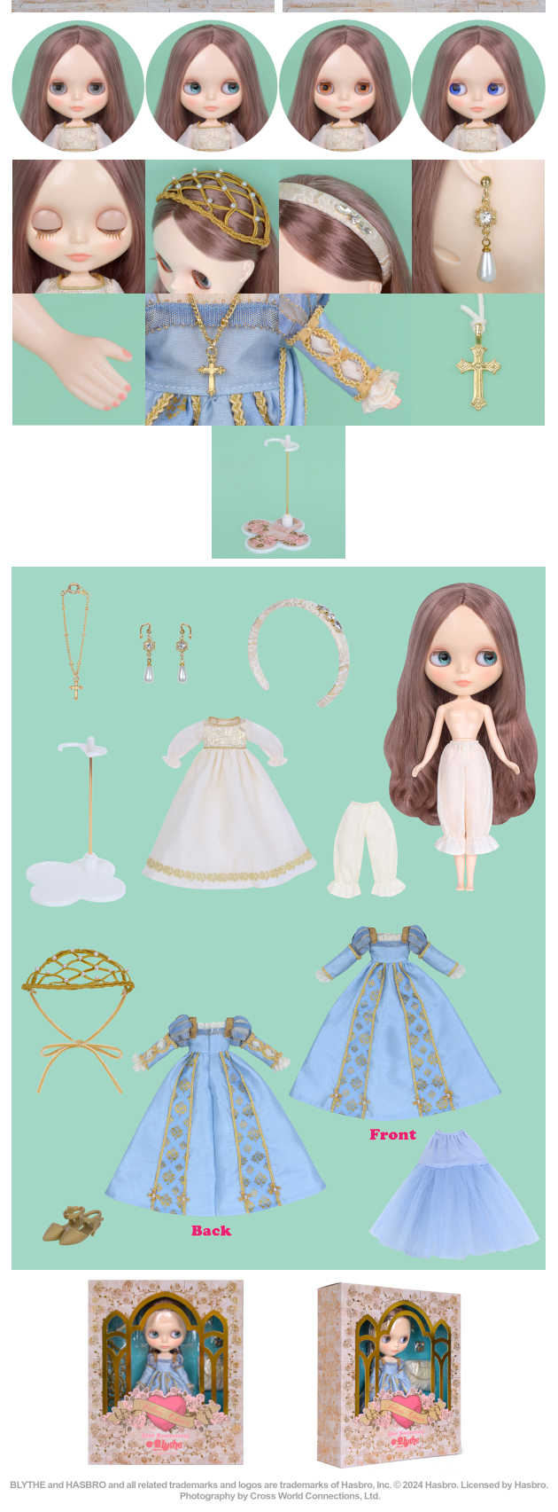 [Set contents] Doll, dress (2 dresses, blue and white), head dress, headband, earrings, necklace, petticoat, drawers, shoes, stand