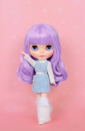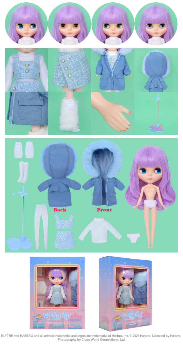 Doll, set-up (top, skirt), knit, mod coat, leg warmers, tights, shorts, shoes, stand (waist restraint)